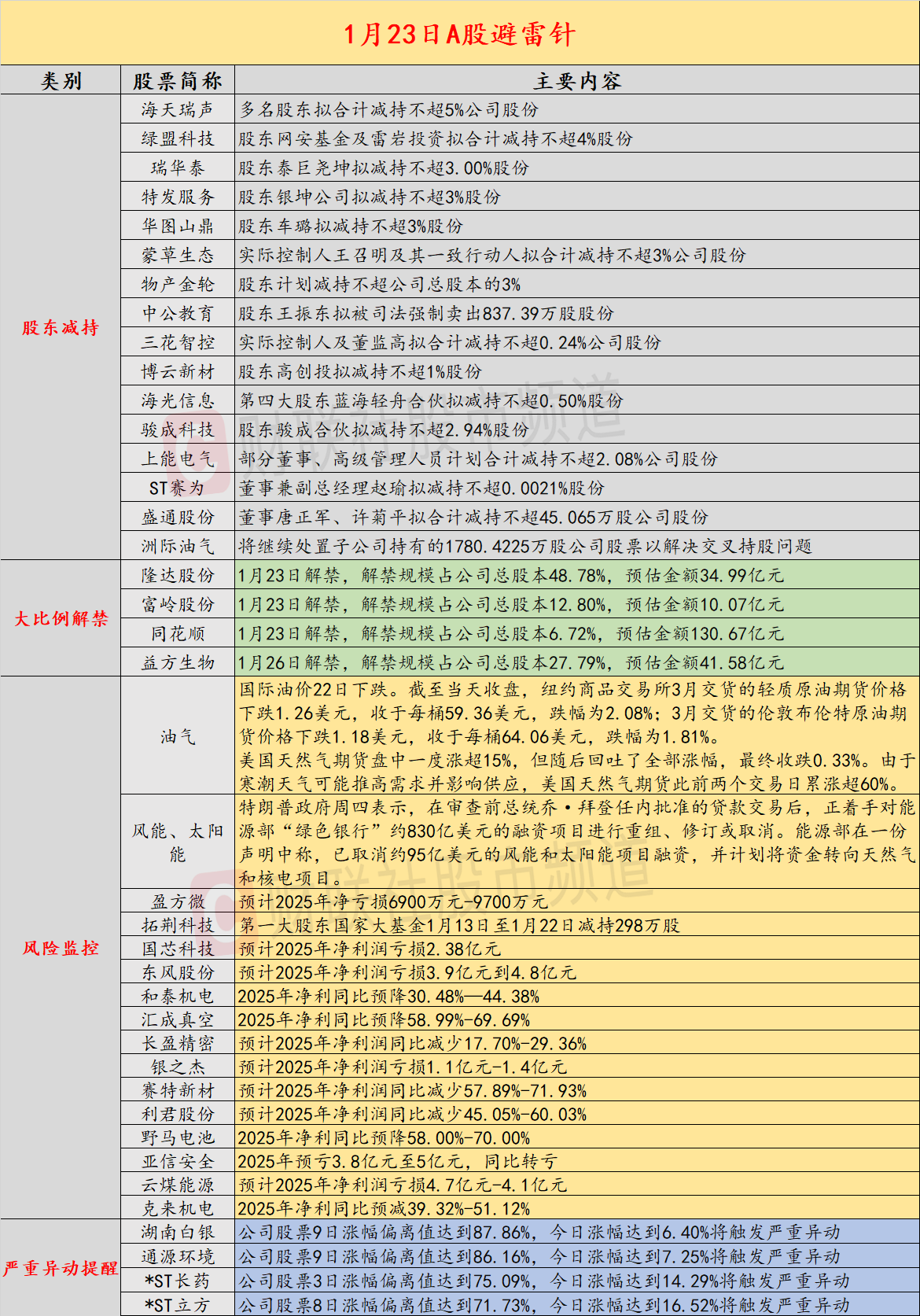 导读:财联社1月23日投资避雷针,近日,A股及海外市场潜在风险事件如下。国内经济信息方面包括:1)居民短期消费贷余额跌至9.5万亿元下方,为三年来最低;2)市场监管总局首次对公用事业领域企业并购亮红牌;公司方面重点关注包括:1)3连板盈方微预计2025年净亏损6900万元-9700万元;2)海天瑞声多名股东拟合计减持不超5%公司股份;海外市场重点关注包括:1)英特尔发布疲软一季度业绩指引,盘后股价一度大跌超13%;2)美国能源部取消约95亿美元风能和太阳能项目,并计划将资金转向天然气和核电项目。