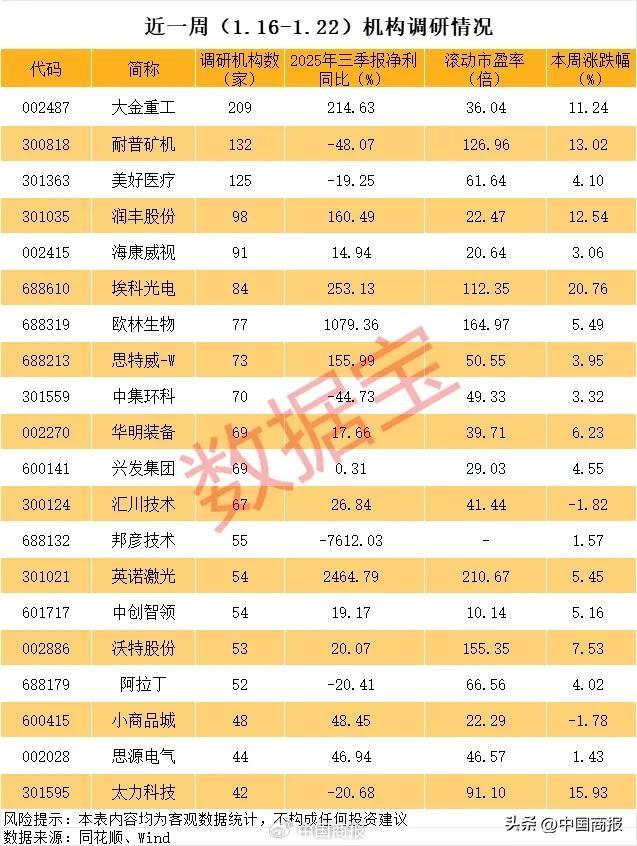 据统计,截至1月23日18时,共有超过150家A股公司披露本周接待机构调研情况。接待调研机构数量最多的是大金重工,公司海外海上风电业务表现受到超过200家机构关注。根据大金重工披露的业绩预告,2025年度,公司预计实现归母净利润10.5亿元至12亿元,同比大幅增长121.58%至153.23%,海外海风项目的交付量和交付金额快速增长是核心原因。