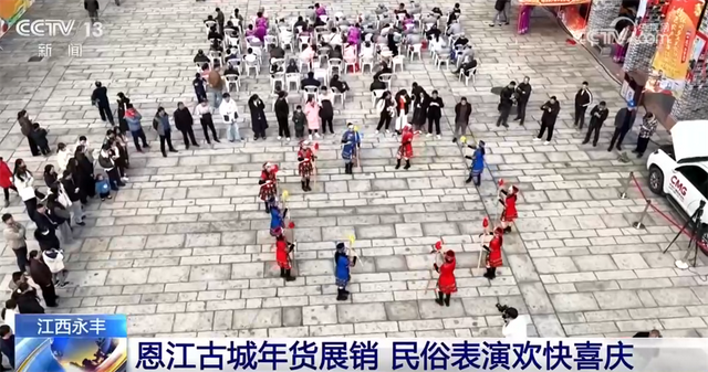 在江西吉安永丰县恩江古城的年货展销区,现场人气满满,很多都是全家老小一起来赶集置办年货。数个摊位前,身着鲜艳民族服饰的工作人员正在向顾客们介绍自家的农特产品,而不远处的民族歌舞表演更是引来阵阵掌声。