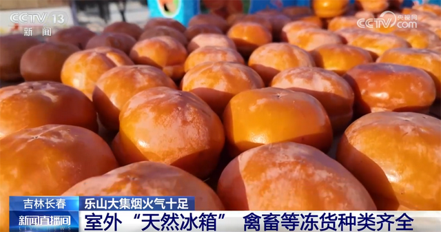 接着往里走,这里就是东北特色十足的生鲜冻货区了。长春的冬天,室外零下20多摄氏度,堪称“天然大冰箱”。您看这冻鱼、冻豆包冻得老硬了,还有冻梨、冻柿子,都是东北人节庆团圆必备的滋味,化透之后一口咬下去满是汁水,清甜可口。