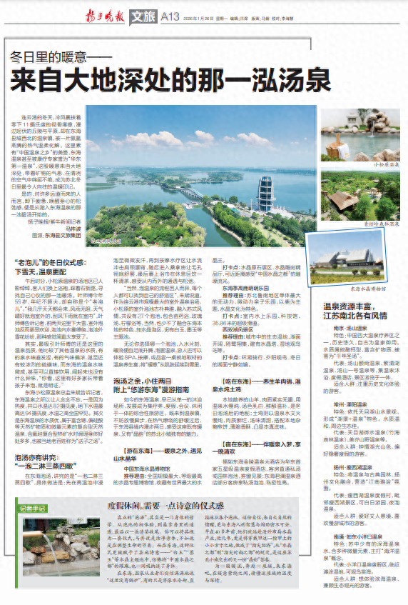 如今的东海温泉,早已从单一的沐浴场所,发展成为集疗养、度假、会议、休闲于一体的综合性旅游区。既来到温泉镇,不妨放慢脚步,在热气缭绕的舒缓过后,于东海县境内漫步两日,感受这座既有暖泉、又有“晶韵”的苏北小城独有的魅力。