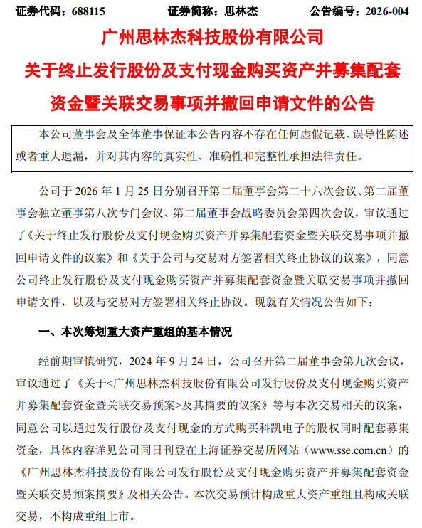 思林杰(688115)1月25日晚间公告称,公司于2026年1月25日分别召开第二届董事会第二十六次会议、第二届董事会独立董事第八次专门会议、第二届董事会战略委员会第四次会议,审议通过了《关于终止发行股份及支付现金购买资产并募集配套资金暨关联交易事项并撤回申请文件的议案》和《关于公司与交易对方签署相关终止协议的议案》,同意公司终止发行股份及支付现金购买资产并募集配套资金暨关联交易事项并撤回申请文件,以及与交易对方签署相关终止协议。