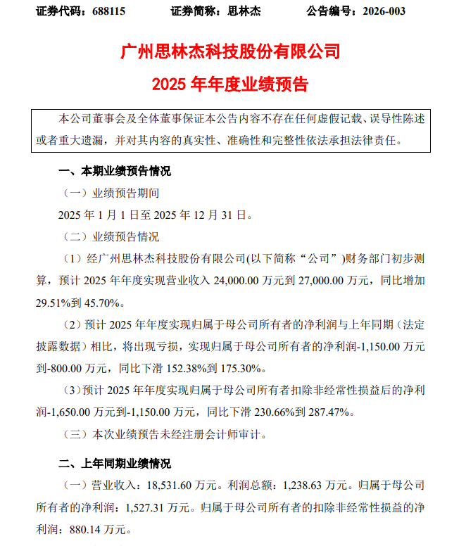 日前,思林杰发布了2025年度业绩预告,经公司财务部门初步测算,预计2025年度实现营业收入24000万元到27000万元,同比增加29.51%到45.70%;预计2025年度实现归属于母公司所有者的净利润与上年同期(法定披露数据)相比,将出现亏损,实现归属于母公司所有者的净利润-1150万元到-800万元。