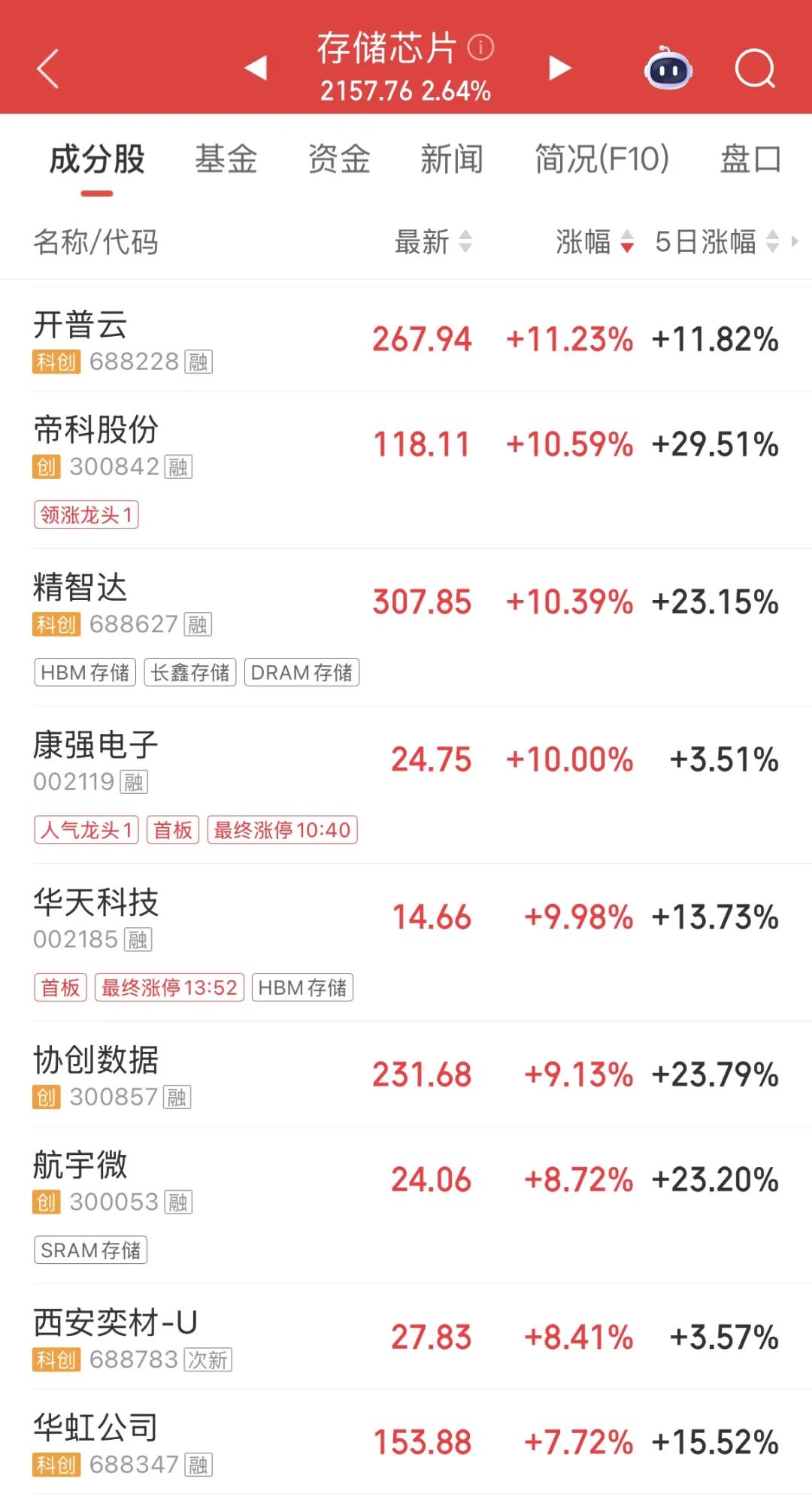 午后,存储芯片、共封装光学(CPO)等板块表现活跃。截至收盘,东芯股份“20CM”涨停,康强电子、华天科技涨停;半导体晶圆代工龙头华虹公司盘中一度涨超9%,股价创历史新高。