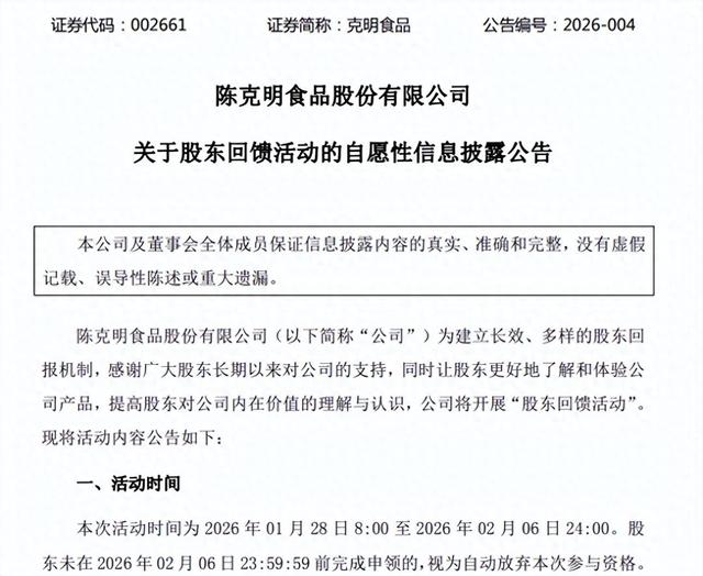 1月27日,克明食品(002661)发布公告,公司将开展“股东回馈活动”。