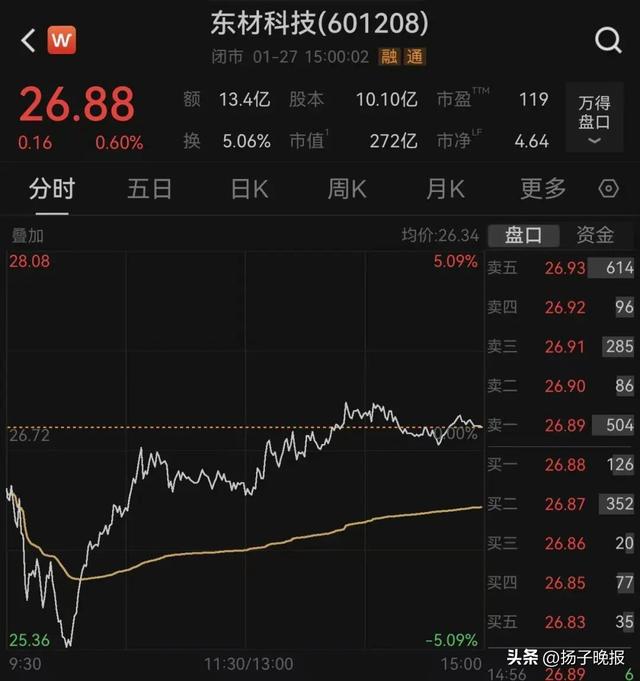 二级市场上,东材科技1月27日收涨0.6%报26.88元/股,最新市值为26.88亿元。