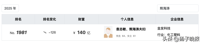 2025年3月27日,胡润研究院发布《2025胡润全球富豪榜》,袁志敏、熊海涛以140亿财富位列榜单第1981位。