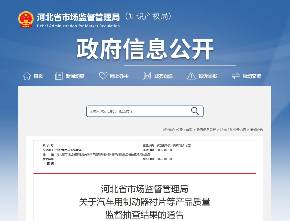 河北省市场监督管理局关于汽车用制动器衬片等产品质量监督抽查结果的通告