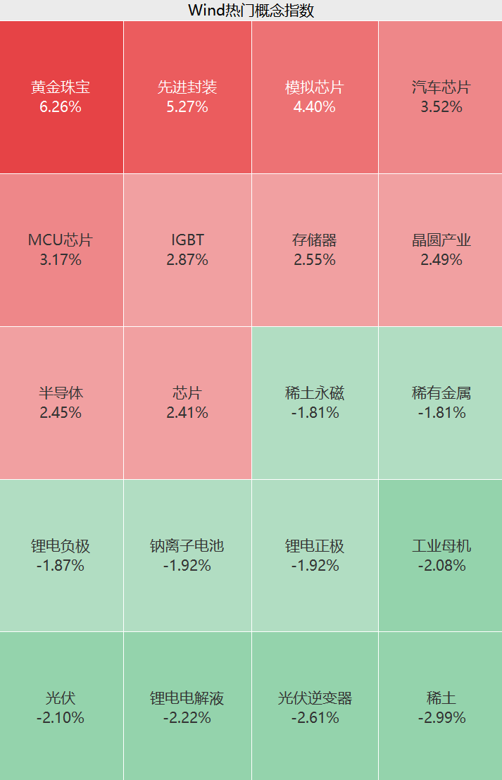 盘面上,上午贵金属、半导体芯片、石油天然气等板块走强,黄金概念股再掀涨停潮,先进封装、汽车芯片、存储器等概念股纷纷大涨;稀土、光伏、锂电等概念股不振;前期大牛股淳中科技,连续两日跌停。