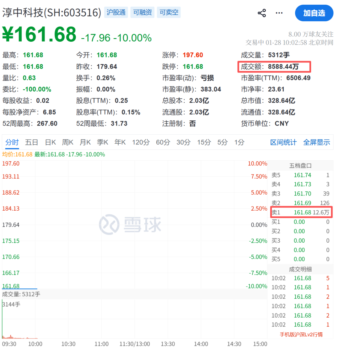 1月28日,淳中科技在竞价阶段即跌停,报161.68元/股,跌幅为10%,连续两日跌停。截至发稿,淳中科技仍保持一字跌停状态,卖一超12万手,成交额仅8588万元。