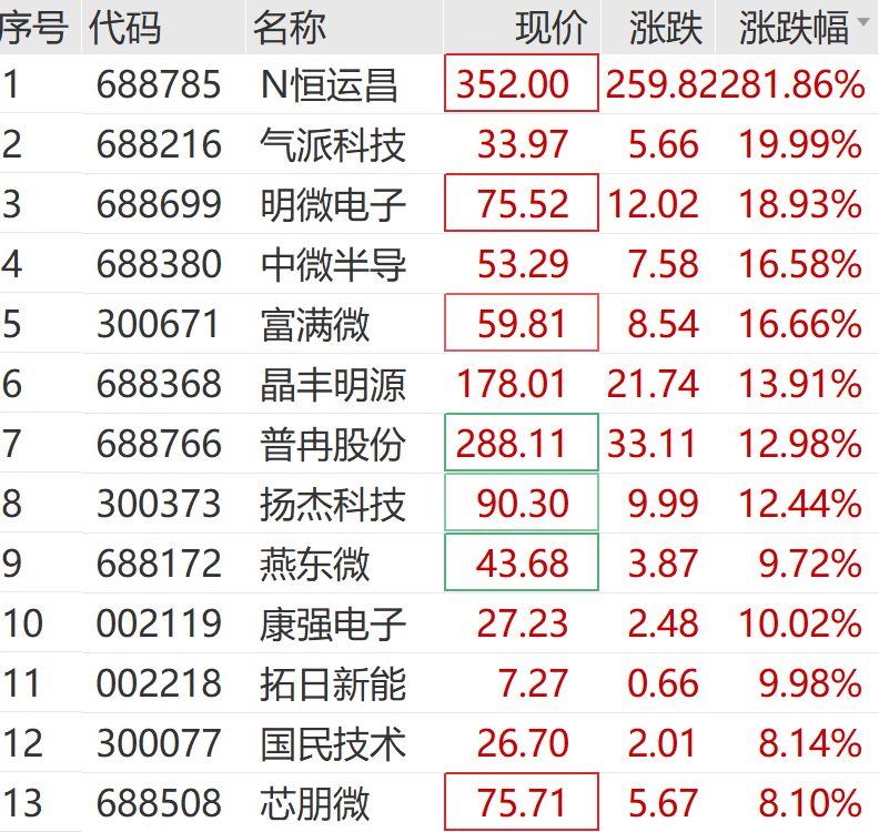 个股方面,气派科技20cm涨停,明微电子盘中触及20cm涨停,富满微、中微半导等多股涨超10%,康强电子、拓日新能等涨停。