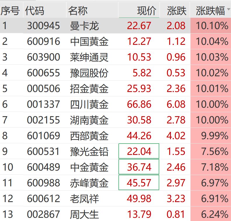 1月28日,贵金属板块延续近期热度,黄金珠宝概念方向猛涨。中国黄金4连板,湖南黄金3连板,四川黄金10日7板,招金黄金8日6板,豫园股份、莱绅通灵、西部黄金等涨停。