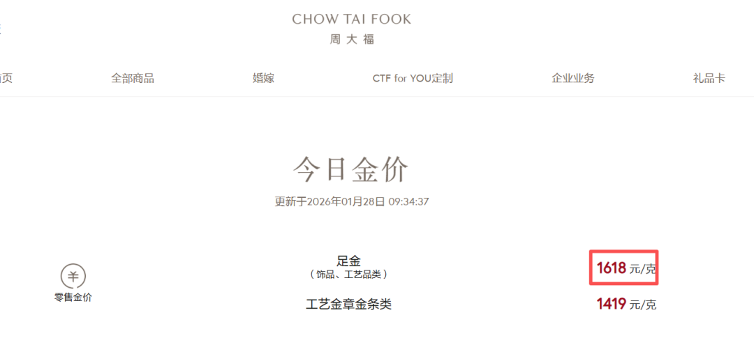 与此同时,国内黄金饰品价格水涨船高。1月28日,多家黄金珠宝品牌当日公布的境内足金首饰价格大幅上调,周生生报价1614元/克,周大福报价1618元/克,老凤祥报价1620元/克,老庙黄金报价1612元/克。