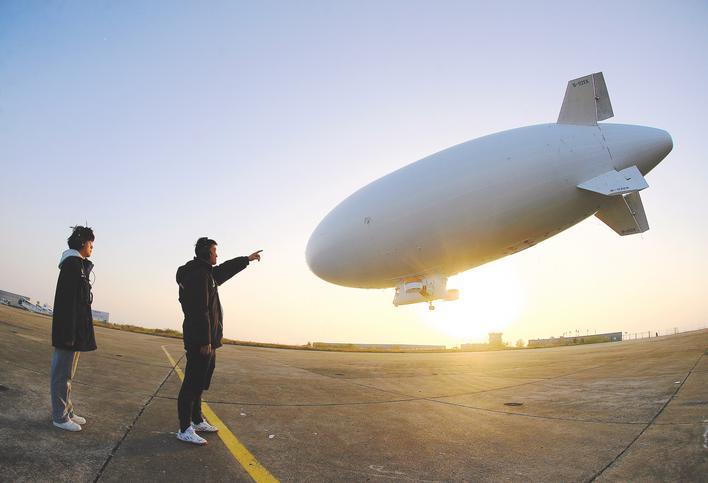 2025年11月27日,国产“祥云”AS700载人飞艇在荆门市漳河机场开展驾驶员转场飞行训练,为飞艇投入商业运营做准备。 (视界网 赵平 梅春艳 摄)