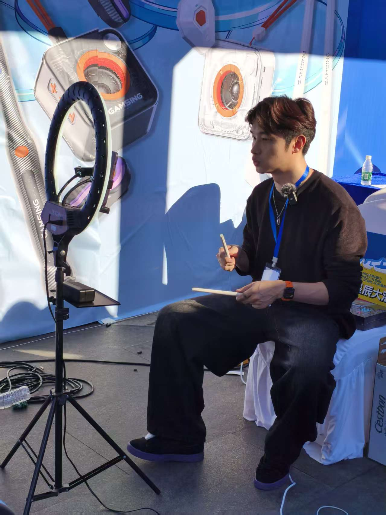 感音科技工作人员正在直播示范空气架子鼓的功能