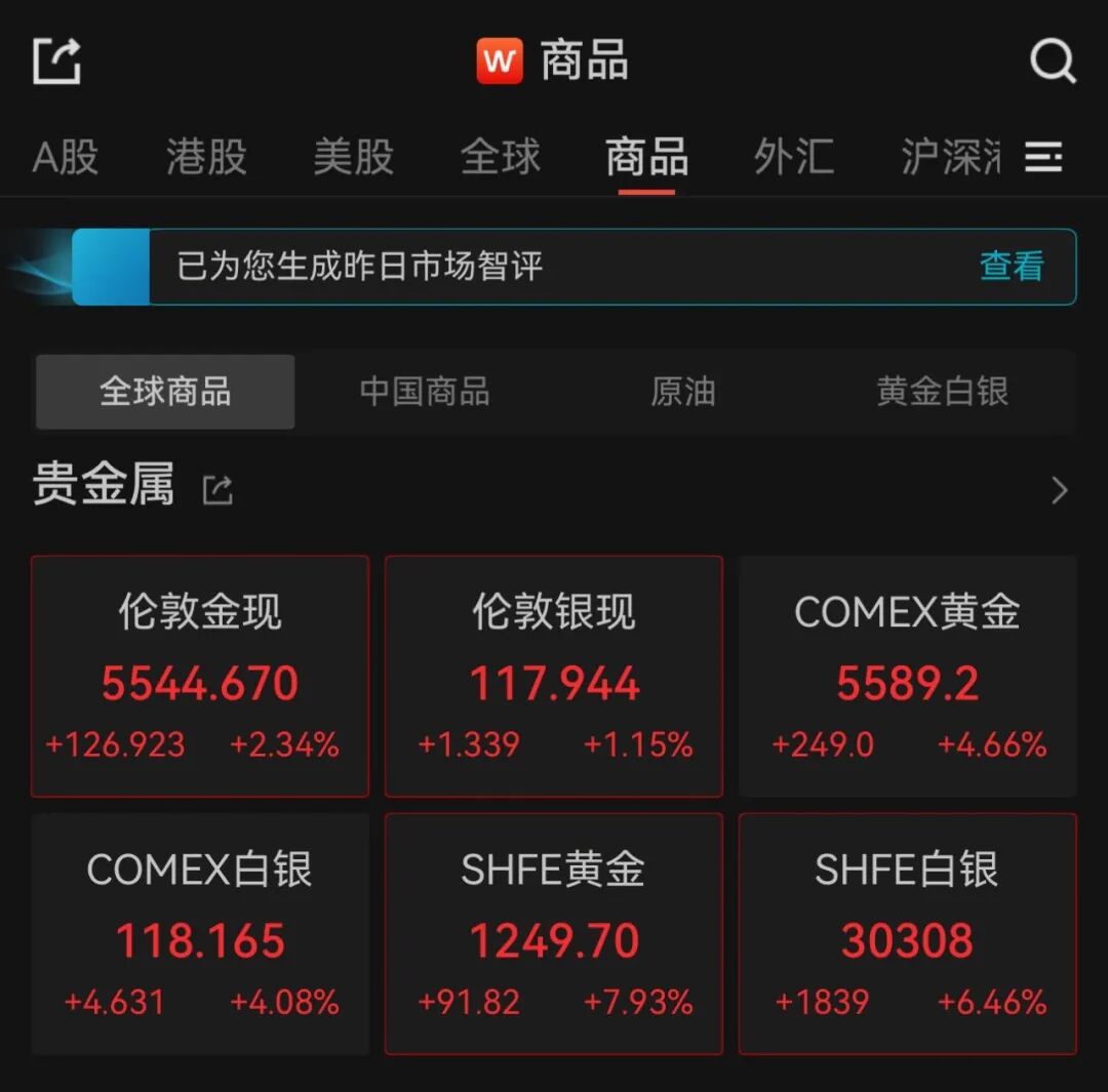 1月29日,国际金价再次大幅上涨,现货、期货双双站上5500美元/盎司,其中,黄金期货一度突破5600美元/盎司关口。截至13时30分,COMEX黄金报5589.2美元/盎司,上涨4.66%;伦敦金报5544.670美元/盎司,上涨2.34%。