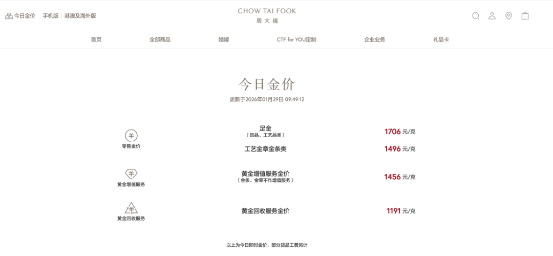 1月29日,多家金饰品牌足金报价突破1700元/克。其中,周大福报1706元/克,较昨日上涨88元/克;周生生报1708元/克,较昨日上涨94元/克;老庙黄金报1706元/克,较昨日上涨94元/克;老凤祥报1713元/克,较昨日上涨93元/克。