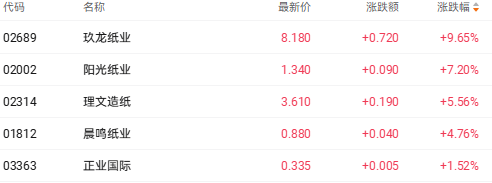 截至收盘,玖龙纸业(02689.HK)涨9.65%、阳光纸业(02002.HK)涨7.20%、理文造纸(02314.HK)涨5.56%。