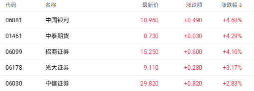 截至收盘,中国银河(06881.HK)涨4.68%、招商证券(06099.HK)涨4.10%、光大证券(06178.HK)涨3.17%。