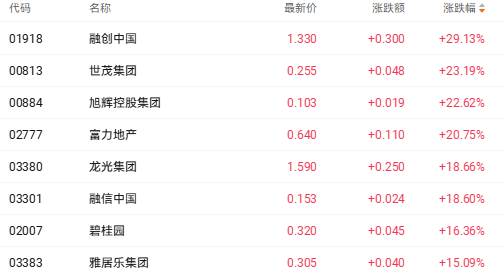 截至收盘,融创中国(01918.HK)涨29.13%、世茂集团(00813.HK)涨23.19%、龙光集团(03380.HK)涨18.66%。