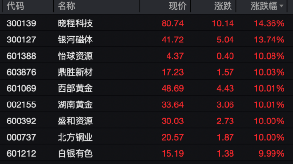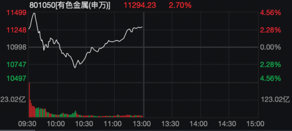 有色金属板块剧烈波动,上午开盘整体大涨,后盘中一度转跌,随后再度拉升。截至午间收盘,板块涨幅为2.7%。板块内个股中,多数股票实现大涨,其中湖南黄金、西部黄金、北方铜业、盛和资源等多股涨停。