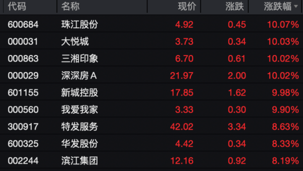 房地产板块亦涨幅居前,板块盘中涨幅一度超过3%。珠江股份、大悦城、深深房A、三湘印象等多股盘中涨停。
