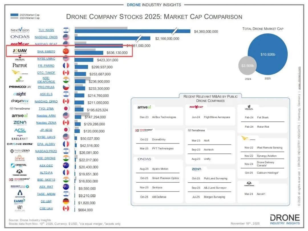 据了解,Droneii发布的报告凭借其独立性、全球视野和严谨的分析框架等特点,成为全球无人机产业投资与趋势判断的重要风向标。细看本次榜单,有来自以色列、美国、中国、法国、加拿大、澳大利亚等国家的26家无人机企业上榜。报告称,今年的总体趋势让人十分振奋,上榜企业的总市值相比去年增加73.6亿美元,达到109.26亿美元,显示出强劲增长潜力。
