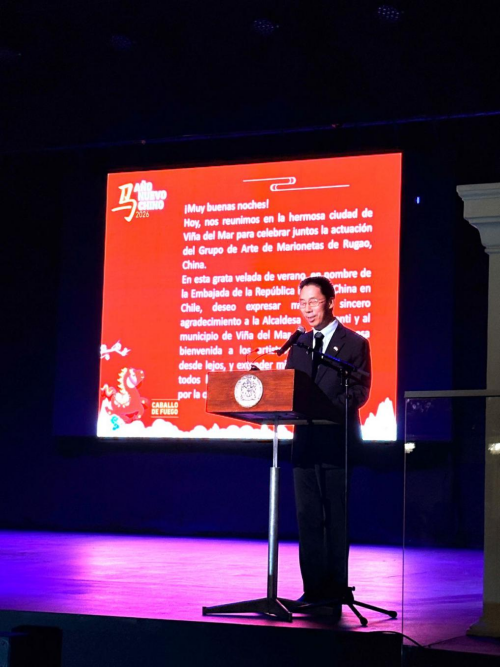 2026年1月27日,由驻智利使馆、智利维尼亚德尔玛市政府及圣托马斯孔子学院联合主办的“东方戏偶之韵”木偶剧专场演出在维市成功举行。驻智利大使牛清报出席活动并致辞,演出结束后上台亲切慰问演职人员。
