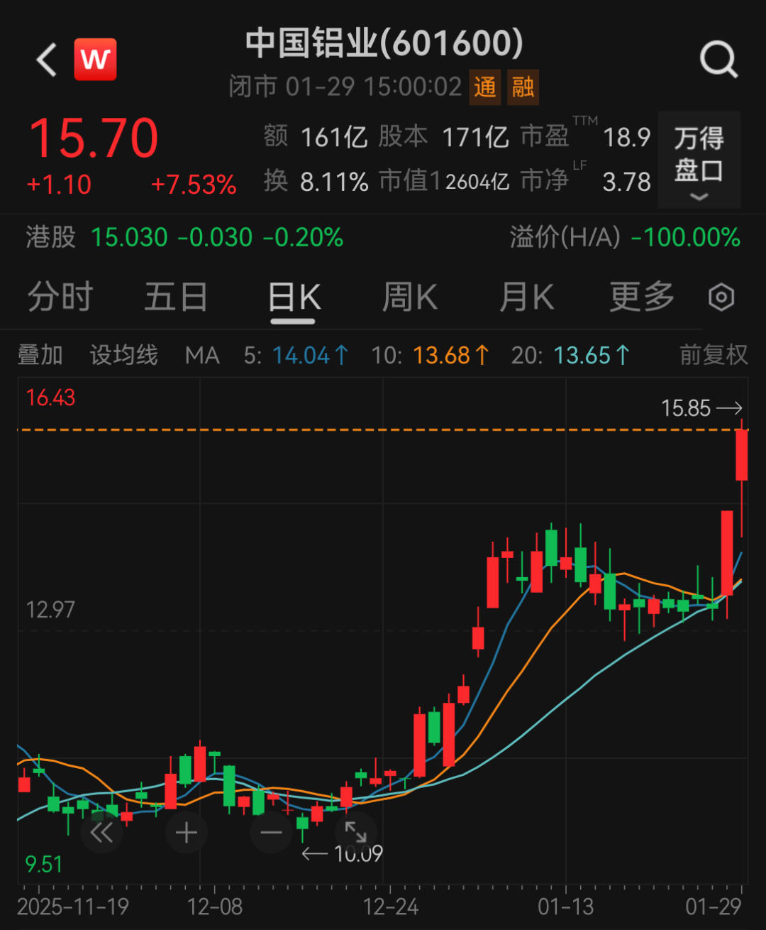 1月29日,中国铝业股价大涨7.53%,最新市值为2604亿元。