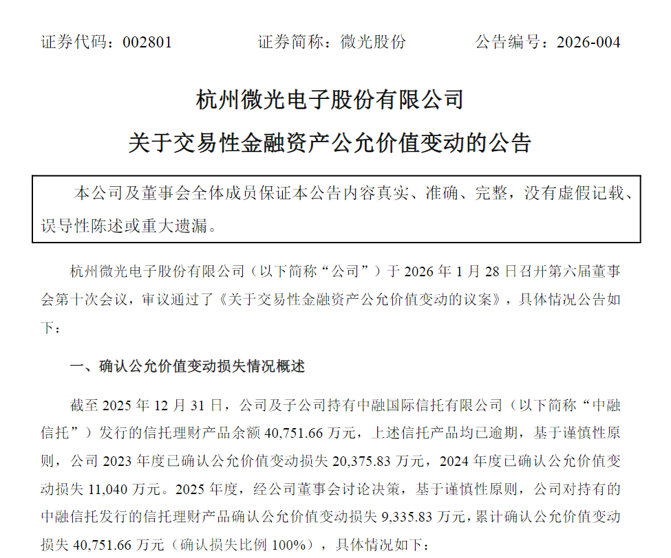 微光股份的公告显示,截至2025年12月31日,公司及子公司持有中融信托发行的信托理财产品余额4.08亿元,且所有产品均已逾期。基于谨慎性原则,公司2023年度确认公允价值变动损失2.04亿元,2024年度确认1.1亿元,2025年度再确认9335.83万元,累计确认损失占比达100%。