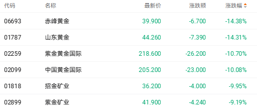 截至收盘,赤峰黄金(06693.HK)跌14.38%、山东黄金(01787.HK)跌14.31%、紫金黄金国际(02259.HK)跌10.70%。