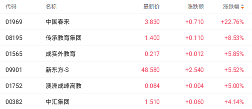 截至收盘,中国春来(01969.HK)涨22.76%、成实外教育(01565.HK)涨5.85%、新东方-S(09901.HK)涨5.52%。