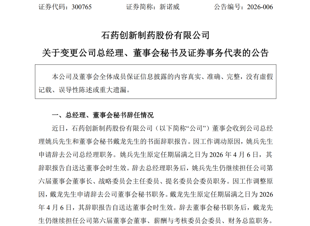 1月30日早间,新诺威(证券代码:300765)发布变更公司总经理、董事会秘书及证券事务代表的公告:原董事会秘书、证券事务代表戴龙辞任,同时被聘任为公司新一任总经理。
