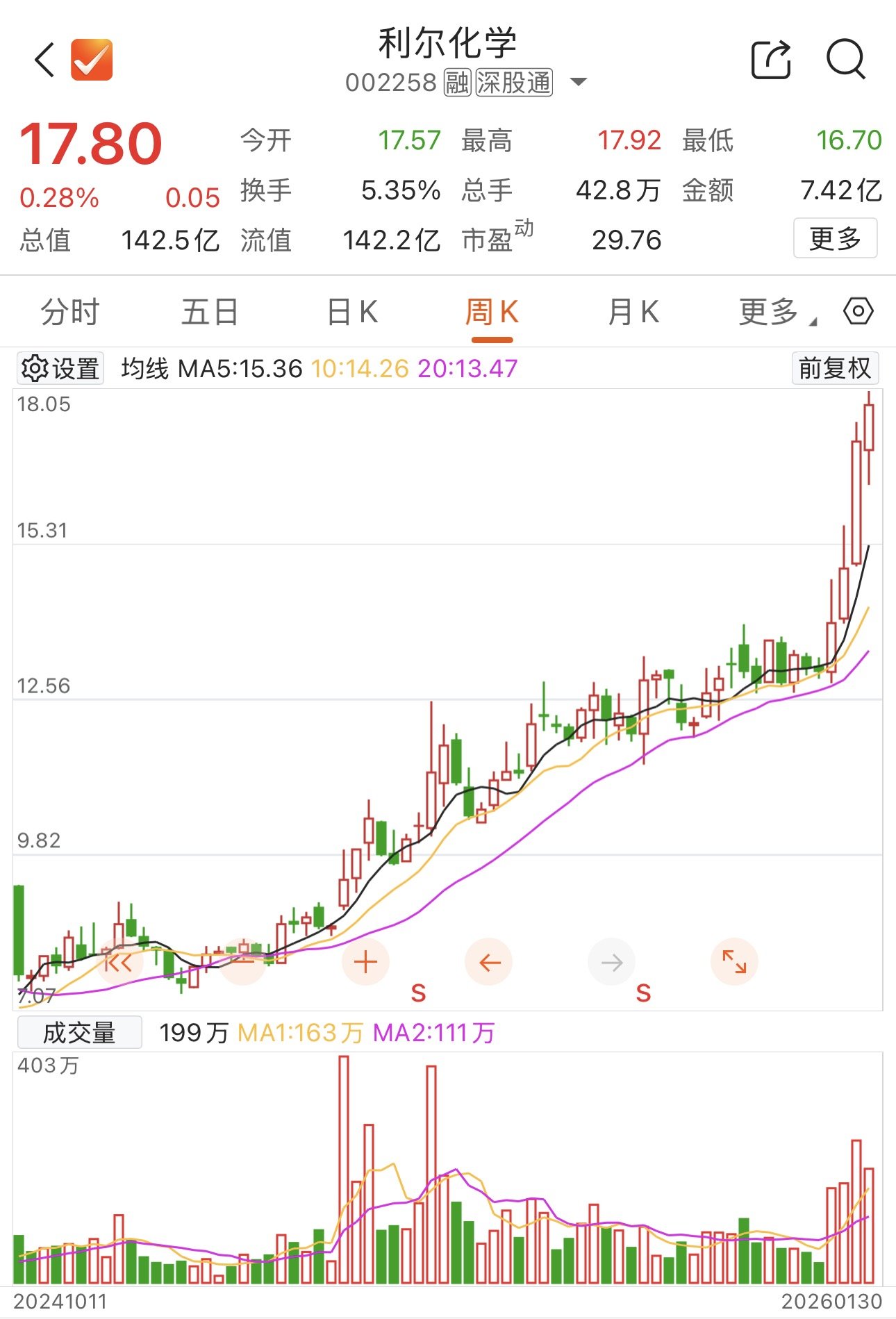 利尔化学公告,2025年归属公司股东净利润为4.60亿元至5.00亿元,同比增长113.62%至132.19%。该公司主营业务是氯代吡啶类、有机磷类等高效、低毒、低残留的安全农药原药的研发、生产和销售。