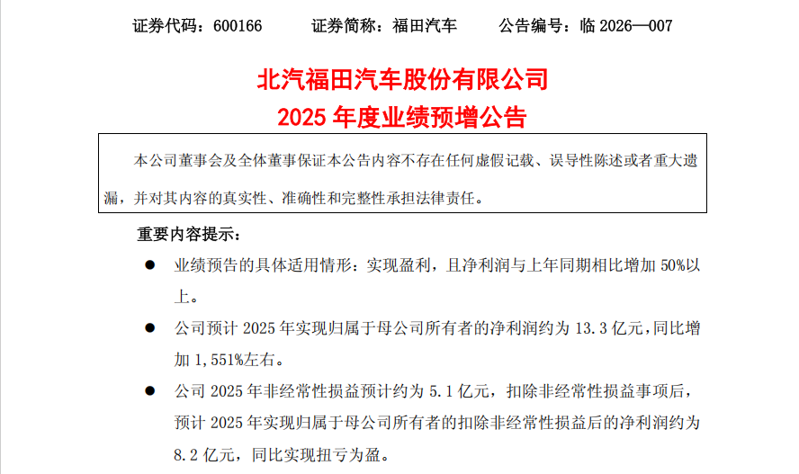 1月30日,福田汽车发布业绩预告称,预计公司2025年的归母净利润约为13.3亿元,同比增长1551%;扣非后净利润为8.2亿元,同比实现扭亏为盈。