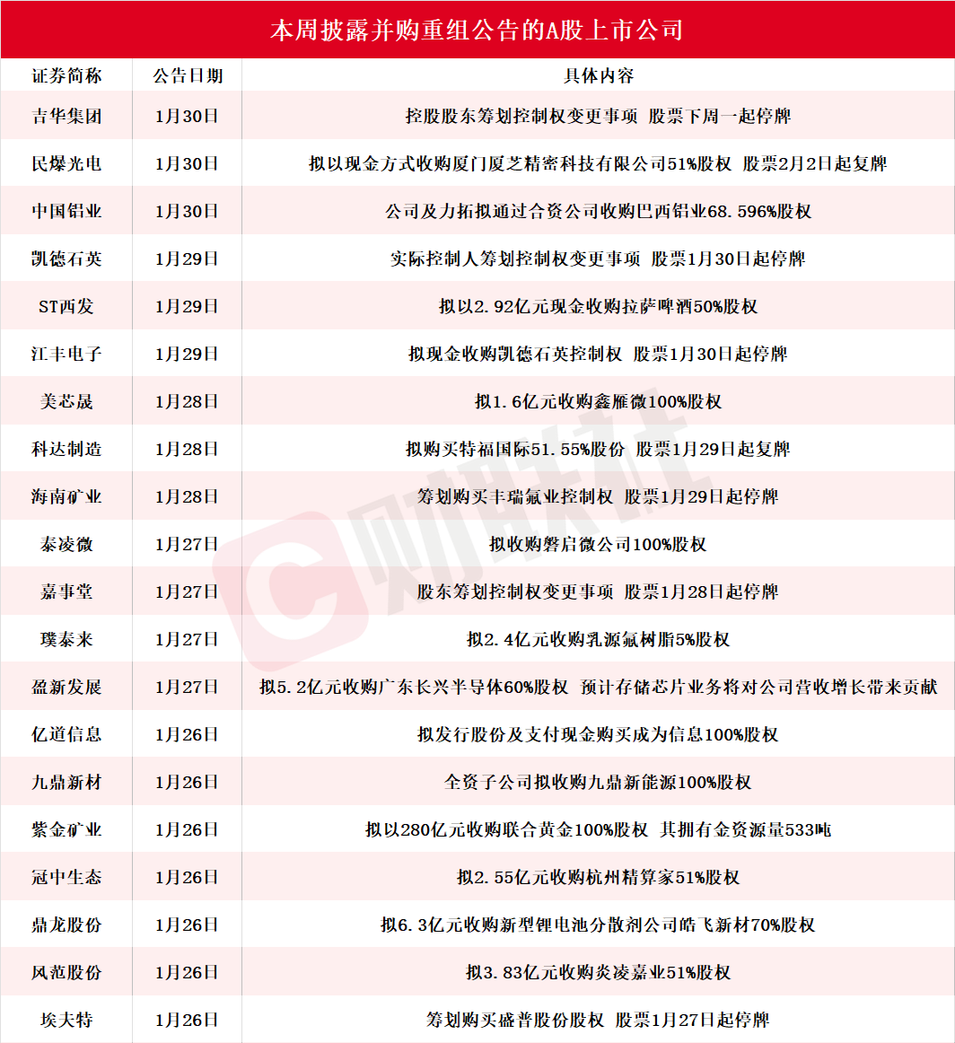 据财联社不完全统计,截至发稿,本周披露并购重组进展的A股上市公司共有20家,包括吉华集团、民爆光电、中国铝业、凯德石英、ST西发(维权)、江丰电子、美芯晟、科达制造、海南矿业、泰凌微、嘉事堂、璞泰来、盈新发展(维权)、亿道信息、九鼎新材(维权)、紫金矿业、冠中生态、鼎龙股份、风范股份、埃夫特,具体情况如下图: