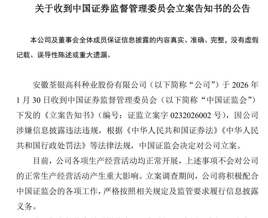 荃银高科发布的公告称,公司于2026年1月30日收到中国证券监督管理委员会下发的《立案告知书》,因公司涉嫌信息披露违法违规,根据《中华人民共和国证券法》《中华人民共和国行政处罚法》等法律法规,中国证监会决定对公司立案。