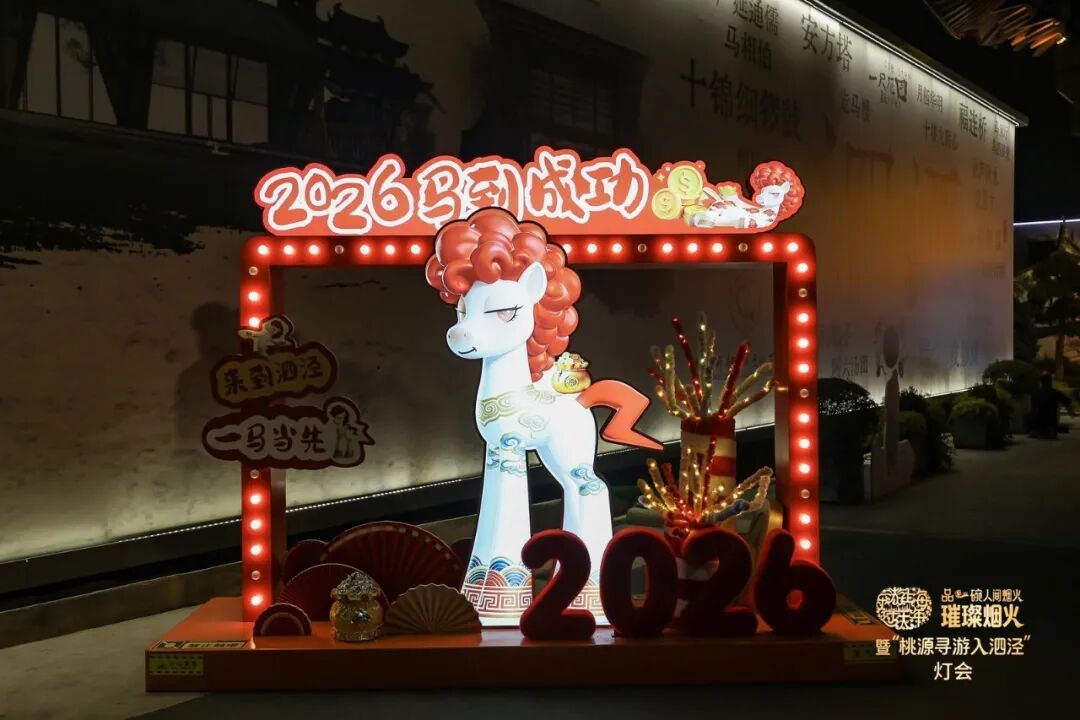 新春元宵期间,南翔古镇以"笼"马精神为主题,将传统灯彩艺术与本土文化巧妙融合。解放街南北路口、双塔区域、混堂弄等区域,搭建多组马年主题小景,以南翔小笼、骏马造型与槎溪十八景交相辉映,传递"龙马精神"的奋斗寓意。光影流转间,传统花灯非遗技艺与现代创意碰撞,为游客带来沉浸式文化体验。