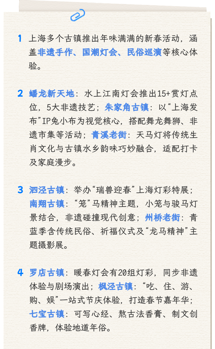 “枫趣中国年 泾彩享团圆”2026枫泾古镇过大年活动,以“古镇寻福,江南韵味”为核心主线,通过精心策划的“吃、住、游、购、娱”一站式节庆体验,打造一场富有文化内涵与时代活力的春节嘉年华,既满足市民游客对年味与品质的需求,也将枫泾塑造为沪上乃至长三角地区春节出游的新兴热选地,推动区域文旅经济高质量发展。