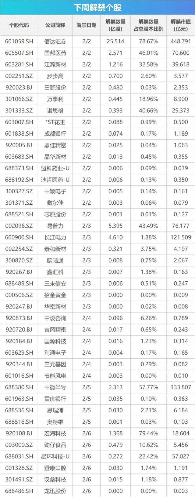 从解禁市值来看,2月2日是解禁高峰期,18家公司解禁市值合计607.1亿元,占下周解禁规模的58.56%。按1月30日收盘价计算,解禁市值居前三位的是:信达证券(448.79亿元)、中微半导(133.81亿元)、长江电力(121.51亿元)。从个股的解禁量看,解禁股数居前三位的是:信达证券(25.51亿股)、易普力(5.39亿股)、长江电力(4.61亿股)。