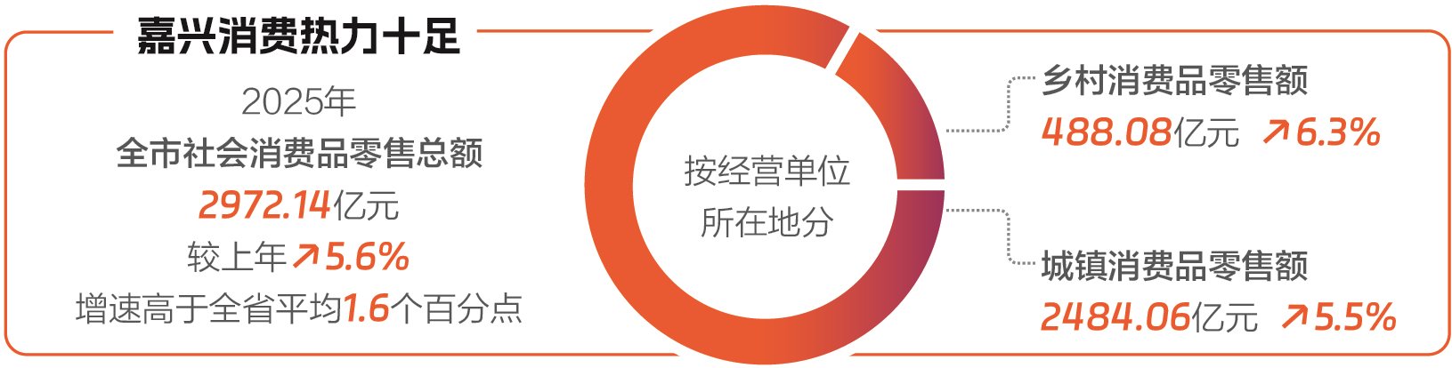 这股扑面而来的消费“热气”,延续着2025年嘉兴消费市场整体升温的态势。嘉兴市统计局最新数据显示,2025年全市社会消费品零售总额达2972.14亿元,同比增长5.6%,增速位居全省第一,高于全省平均1.6个百分点。其中,乡村消费品零售额同比增长6.3%,城乡消费活力同步迸发。