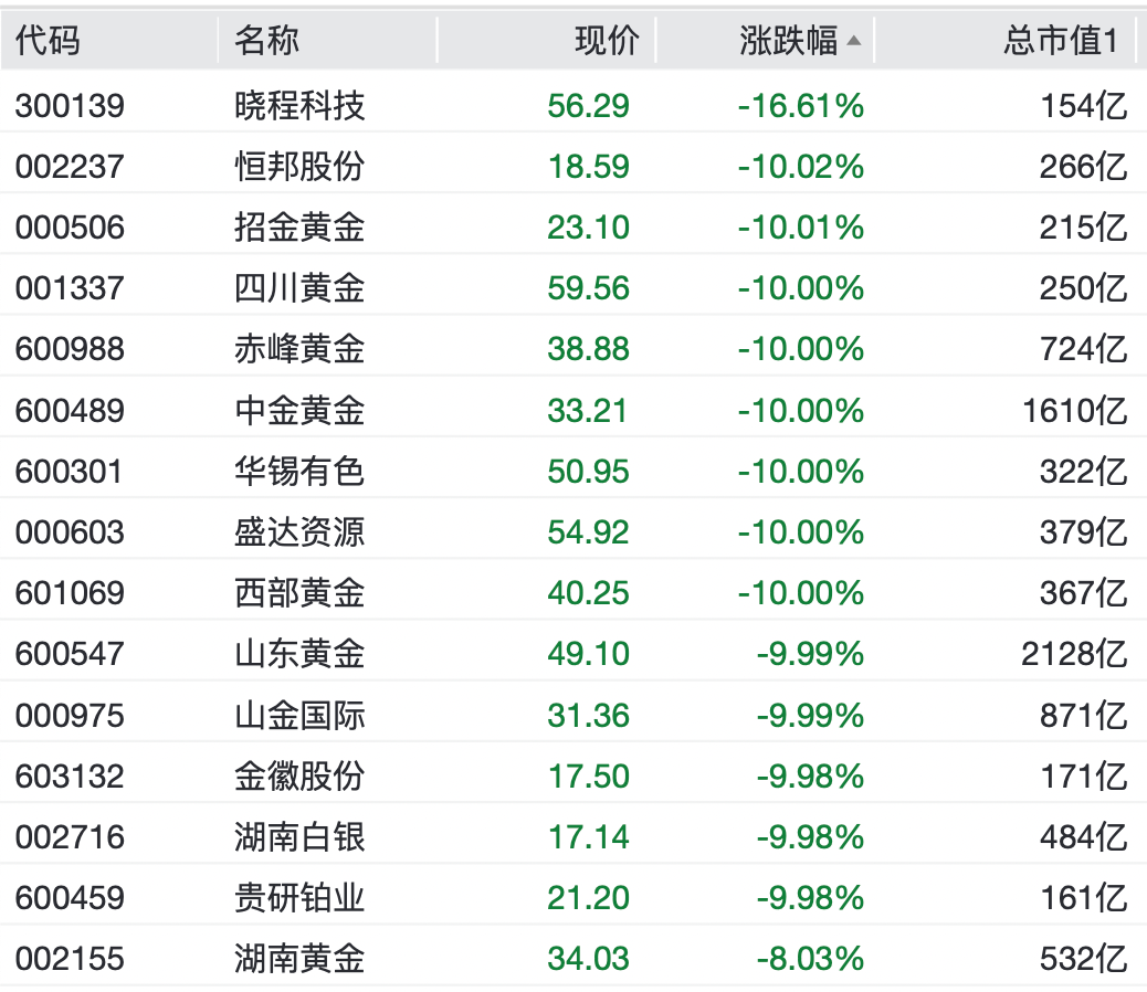 多只个股再次跌停。招金黄金、四川黄金、赤峰黄金、中金黄金、华锡有色、西部黄金、山东黄金、山金国际、金徽股份、湖南白银、贵研铂业均录得10cm跌停。晓程科技跌超16%。