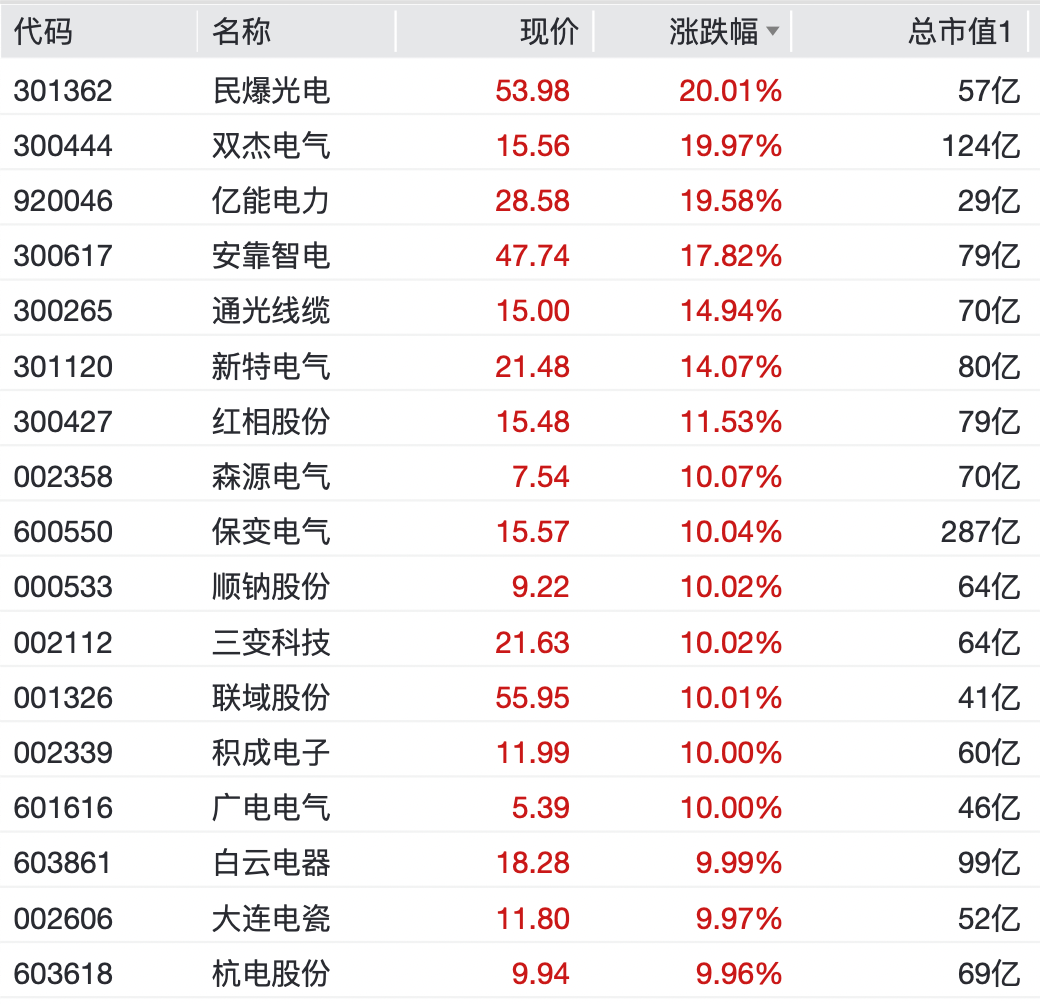 个股掀“涨停潮”!民爆光电、双杰电气录得20cm涨停,森源电气、保变电气、顺钠股份、三变科技、联域股份、广电电气、白云电器、大连电瓷、汉缆股份等均录得10cm涨停。其中多只个股一字涨停。