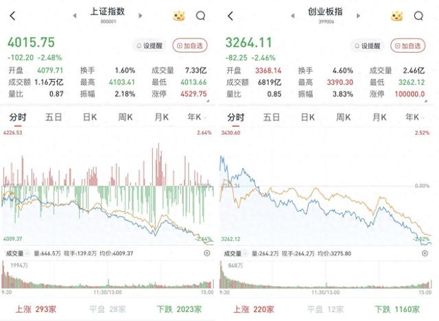 至收盘,上证综指跌2.48%,报4015.75点;科创50指数跌3.88%,报1450.9点;深证成指跌2.69%,报13824.35点;创业板指跌2.46%,报3264.11点。