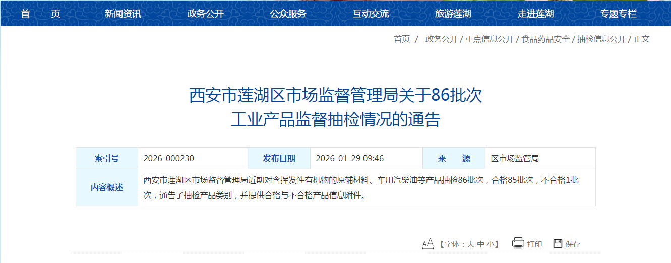 中国质量新闻网讯 据西安市莲湖区人民政府网站消息,近期,西安市莲湖区市场监督管理局对含挥发性有机物的原辅材料、车用汽柴油、燃气具及相关产品等进行了抽检,共计86批次样品。其中,合格产品85批次,不合格产品1批次。现通告如下: