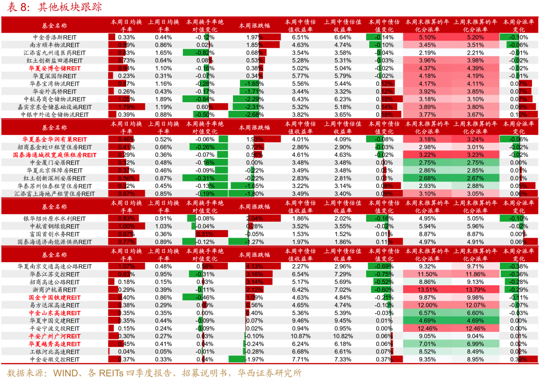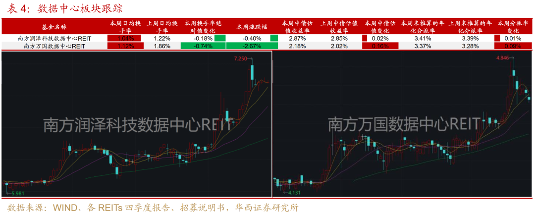 数据中心(IDC)板块:本周回撤较大,润泽科技、万国数据中心分别收跌0.40%、2.67%,万国数据中心日均换手率从1月19-23日的1.86%下滑至1.12%。受益于权益市场的AI算力板块需求强劲情绪,项目未来经营需求可持续性较好,行业景气度高。润泽、万国动态分派率目前分别约为3.41%、3.37%,已接近租赁型项目分派率参考值3.32%,关注后续波动机会。