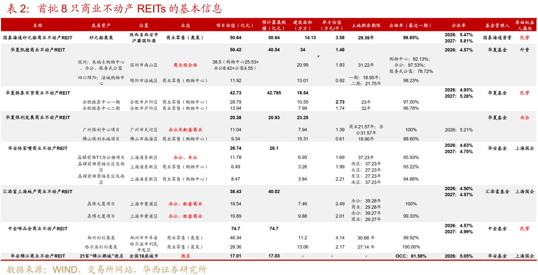 2026年1月29-30日,首批8只商业不动产REITs已被上交所受理。首批8只商业不动产REITs中,业态涉及商业综合体、办公、酒店、商业零售(购物中心、奥莱),原始权益人涉及民营企业(砂之船奥莱、银泰百货、杉杉商业)、外资企业(凯德商用)、上海国企(陆家嘴集团、上海地产集团、锦江国际集团)、央企(保利发展),合计募集规模约314.75亿元,其中规模最大的是中金唯品会商业不动产(74.7亿元),规模最小的为华安锦江商业不动产(17.03亿元)。