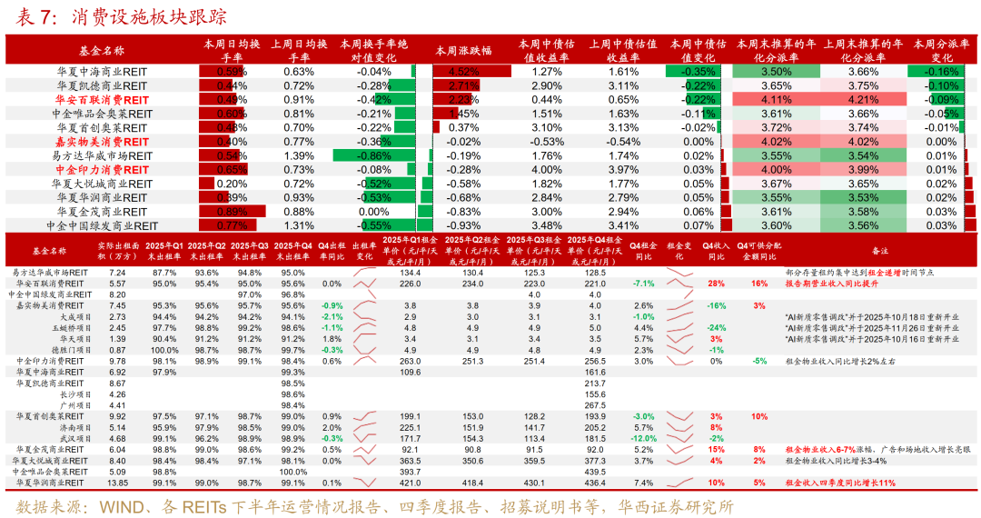 消费基础设施板块本周上涨0.22%,涨幅靠前的是华夏中海商业(+4.52%)、华夏凯德商业(+2.71%)和华安百联消费(+2.23%),跌幅靠前的是中金中国绿发商业(-0.93%)和华夏金茂商业(-0.83%)。今年春节偏晚,消费热潮持续保障各项目1季度业绩,目前分派率仍然较高的有华安百联消费、嘉实物美消费和中金印力消费。