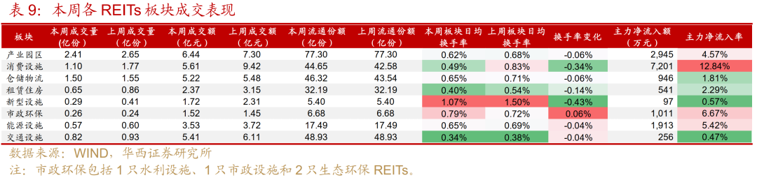 分板块来看,除了市政环保外,本周各资产板块换手率均下滑,换手率靠前的是新型设施(1.07%)和市政环保(0.79%),靠后的是交通设施(0.34%)。新型设施换手率下降最大,消费设施的主力净流入率较大,关注消费板块的成交情况。