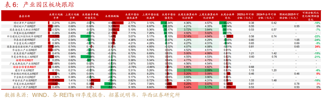 目前产业园区板块分派率大致在4.47%,在租赁型REITs中排名靠前。根据各REITs业绩表现来看,多只园区个券2025年可供分配金额同比下滑明显,或较2025年预测值完成度较差,完成度不到80%。仍然建议积极关注基本面稳定(出租率最好在80%以上)、设有收益分配调节机制、分派率靠前的园区REITs,目前仍可关注招商科创、创金合信首农。招商科创REIT在2025-2030年新增注册地址服务费收入。留意华夏金隅智造工场、国泰海通临港创新产业园分别将于2026/2/26、2026/2/27解禁40%、20%的份额。